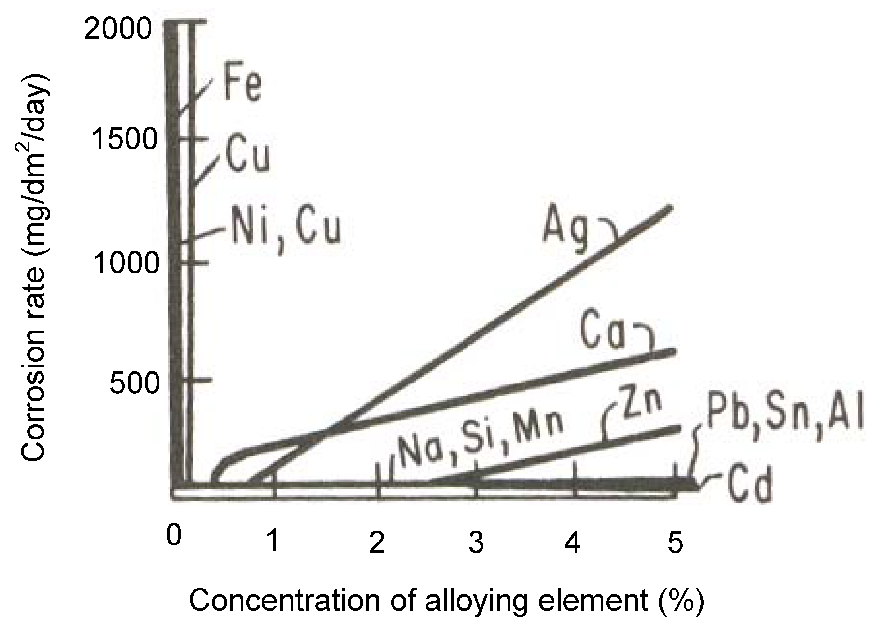 在室温下,杂质和合金元素对3%NaCl溶液中镁腐蚀的影响(所有合金都是由镁和给定元素形成的)[6]。