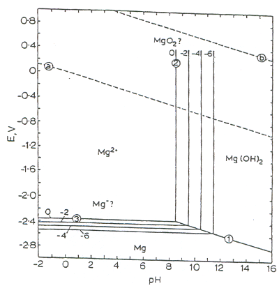 镁-水系统在25°C时的电化学势-pH平衡图[5]。